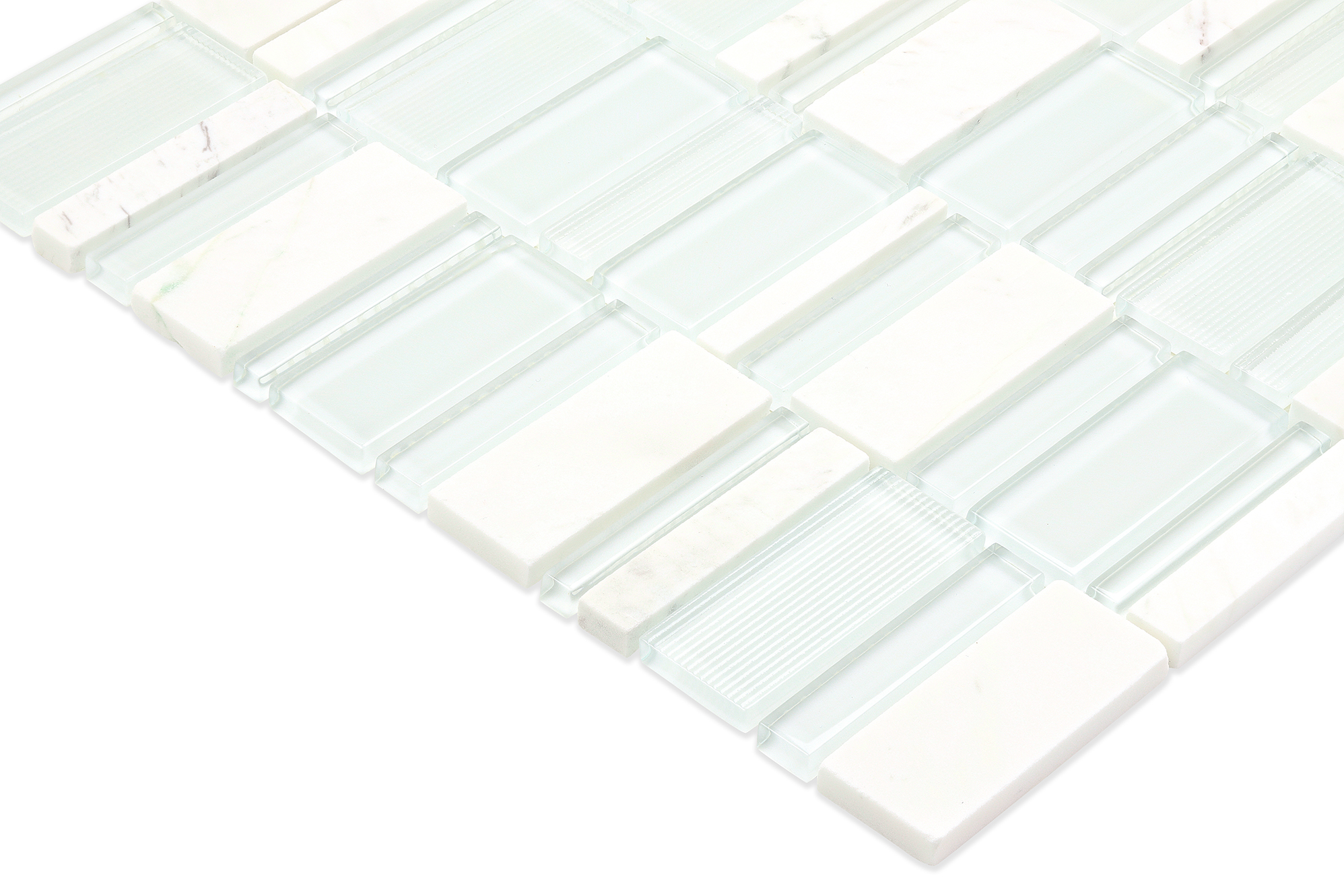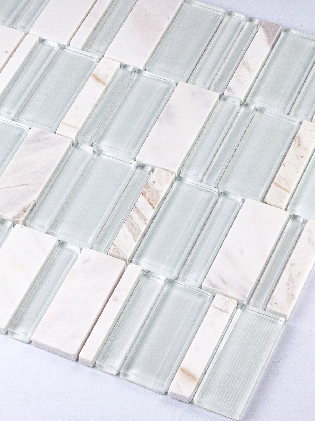 The clean lines and varied rectangular shapes offer a contemporary aesthetic, while the natural marble elements bring an organic, timeless appeal. The smooth glass reflects light, enhancing the brightness of the room, and the marble adds depth and character. Ideal for kitchen backsplashes, bathroom accent walls, or feature areas, this tile creates a focal point that is both stylish and refined.