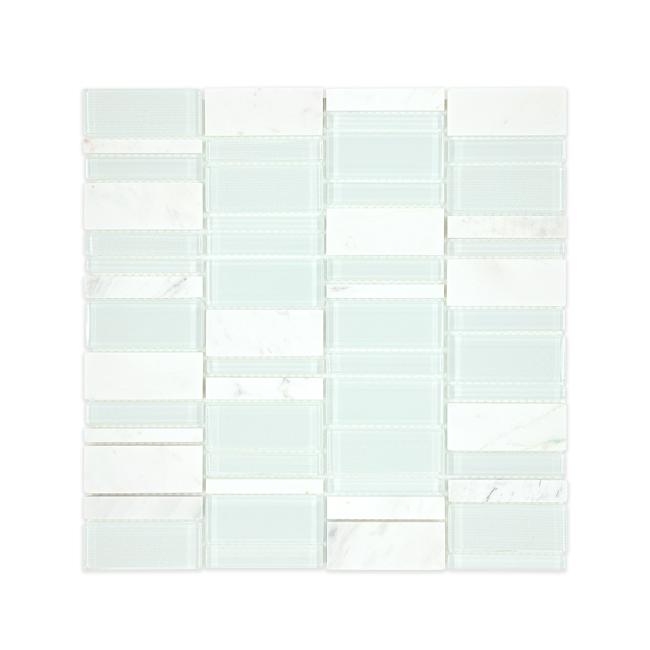 Achieve modern harmony with our Marble & Glass Rectangular Mosaic Tile. The blend of smooth glass and natural marble, arranged in a dynamic rectangular pattern, adds a sophisticated touch to any space.